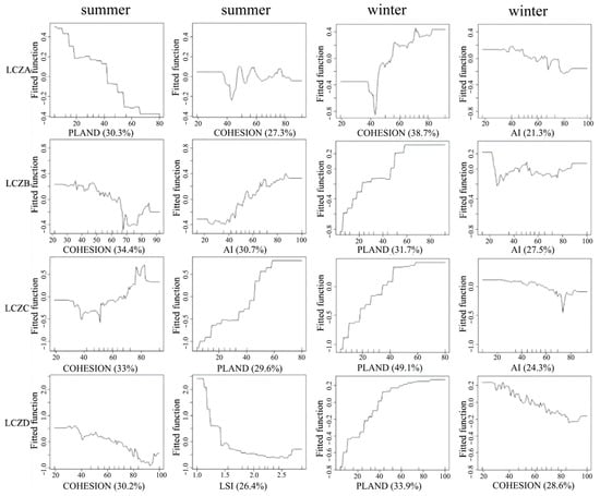 - With the increase in building height, the influencing factors on LST gradually changed from building area to building connectivity and aggregation degree. The higher the connectivity, the better the warming effect, the higher the aggregation degree, and the more significant the cooling effect. For low-rise buildings, the building shape also has a higher impact, especially in winter, when the warming effect is obvious. There are also differences in the same-density buildings. Open middle- and high-level buildings are more reliant on area, whereas intensive middle- and high-level structures are more dependent on aggregation and connectivity. As opposed to open low-level structures, which are more reliant on building shape, dense low-levels depend on aggregation. When compared to winter, the research area is cooled by dense and sparse forests (LCZ A and B), while low vegetation (LCZ D) is more influenced by the patch shape. The more regular the rule, the more noticeable the cooling effect.