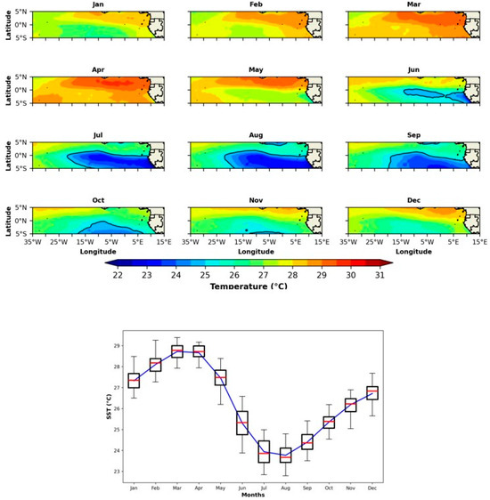 Figure 2 shows the mean seasonal cycle of SST in the ACT region. In Figure 2, the upper panel shows that surface water cooling in the equatorial Atlantic begins around April–May. SSTs in this region decrease due to the upwelling of water caused by the trade winds along the equator, which in turn leads to an increasing temperature gradient between the colder waters of the ACT and the warmer surrounding waters in the Gulf of Guinea [6]. During this period, SSTs in the ACT can range from 27 °C to 29 °C (bottom panel), which is relatively cooler than the surrounding waters in the Gulf of Guinea (northern region). SSTs in the ACT are lowest in June and July. This cold tongue reaches its maximum spatial extent and intensity from August to September. During this period, SSTs are characterized by a broad band of cold water in the central part of the ACT (between 23 °C to 26 °C, bottom panel). This period is characterized by strong trade winds and an upwelling of colder water from the deep ocean, which keeps the tongue cold [6,22]. From August onwards, the ACT SST begins to warm slightly, especially in the western parts. This is associated with a slight weakening of the summer boreal winds, which reduces upwelling and leads to warmer surface waters. SSTs gradually rise to around 27 °C to 28 °C (bottom panel) in the western parts of the ACT, but the cold tongue is still noticeable in the eastern part compared to the warmer surrounding tropical waters. During the boreal winter (November–January), the ACT experiences its highest SSTs, with temperatures approaching 28–29 °C in the equatorial region. This is generally a transitional phase, with the ACT weakening as upwelling decreases and stronger winds return [6,23]. In February–March, ACT SSTs are the warmest of the year, marking the end of the annual cold tongue cycle.