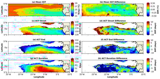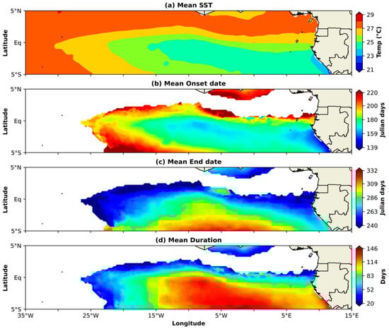 Figure 3a–d show the mean climatology of SST from May to September, ACT onset date, ACT dissipation date, and ACT duration for the period 1979–2019, respectively. The ACT is characterized by water temperatures below 25 °C (Figure 3a). It is the dominant seasonal feature in the eastern equatorial Atlantic, extending westward from the Angolan coast to 15° W longitude (Figure 3a). In general, the ACT begins on 7 June. This date is close to the date obtained by [3], which is 11 June. The difference between this date and ours could be explained by the different data sources and also by the study period, which is much longer in our case. The ACT lasts about 160 days (Figure 3c), with a maximum extension reaching about 10 August, i.e., about 64 days after its appearance (Figure 3d). The mean characteristics of ACT are presented below with the standard deviation across the 41 years: