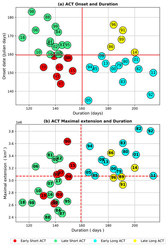 Distribution of years according to (a) ACT duration and onset and (b) ACT duration and maximal extension of the cold tongue over the period 1979–2019. Numbers in circles indicate the last two digits of the corresponding year. The vertical red line represents the mean ACT duration, which is 160 days. In the upper panel, the horizontal red line represents the mean date of ACT onset, which is 7th June, expressed in Julian days. In the lower panel, the horizontal red line represents the mean of the maximal extension of ACT, which is 3.07 × 106 km2.