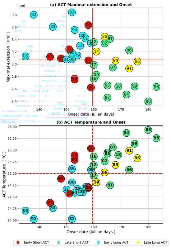 Distribution of years according to (a) ACT onset date and maximal extension of the cold tongue and (b) ACT onset and mean temperature of the cold tongue over the period 1979–2019. Numbers in circles indicate the last two digits of the corresponding year. The vertical red line represents the mean ACT onset, which is 160 days. In the upper panel, the horizontal red line represents the mean date of ACT onset, which is 7th June, expressed in Julian days. In the lower panel, the horizontal red line represents the mean of the maximal extension of ACT, which is 3.07 × 106 km2.