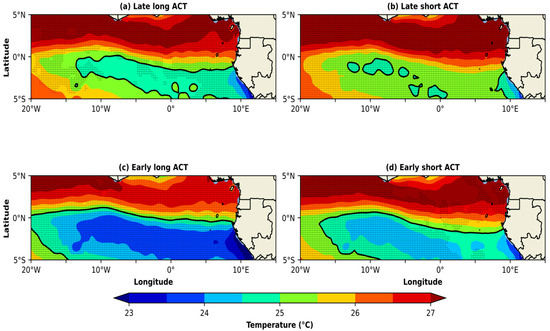 These results complete those of [24], who analyzed the interaction between SST and atmospheric conditions in the Atlantic, illustrating how changes in SST influence the cold tongue’s extent and onset. They also showed that feedbacks between oceanic cooling and atmospheric circulation reinforce the persistence of the cold tongue. These composites are also coherent with the study of [25] on the interconnected nature of the ACT’s characteristics, linking changes in SST to the timing and duration. They find that the cold tongue is most extensive when upwelling is strongest, which correlates with SSTs falling below the critical threshold. In summary, the onset of the ACT is directly linked to the drop in SSTs below a critical threshold (here 25 °C) driven by enhanced trade winds, increased upwelling, and weakened solar heating [26]. As the cold tongue begins to develop in early spring, the SSTs in the region decrease, signaling the onset of the ACT. The duration of the ACT is closely associated with how long the SSTs remain below 25 °C. As SSTs decrease due to enhanced upwelling, the spatial extent of the cold tongue expands. However, the cold tongue’s persistence is largely determined by atmospheric and oceanic conditions, including the intensity of upwelling and wind stress. The authors of [27,28] suggested that the cold tongue’s duration and extent are tightly coupled to seasonal atmospheric and oceanic conditions and feedback mechanisms such as the role of sea surface temperatures in modulating the atmospheric convection patterns, which in turn influence the solar heating and the cold tongue’s characteristics.