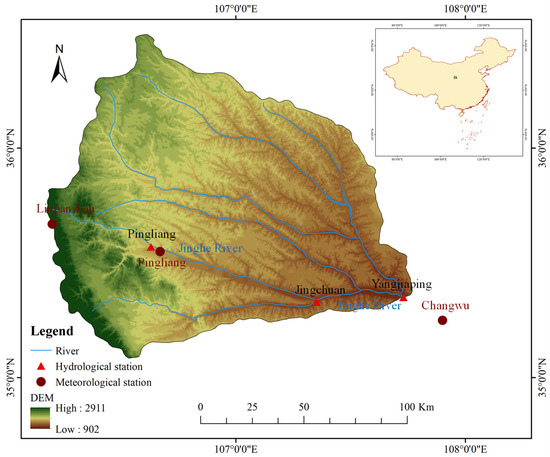 The Jinghe River, originating from the east side of the Liupan Mountain, is a secondary tributary of the Yellow River and a primary tributary of the Weihe River, with a total catchment area of 45,421 km2 and a total length of 455.1 km (Figure 1) [35]. The JRB is located in the temperate continental climate zone, and the precipitation level is low and concentrated around July-September, with an average annual precipitation of 517.9 mm. The runoff is mainly concentrated around July-October, accounting for more than 60% of the annual runoff. Precipitation is the main recharge source of runoff in the JRB. The middle and upper reaches of the Jinghe River are above the YJP hydrological station, with a watershed area of 14,124 km2 and an elevation range from 902 m to 2911 m. The area above the PL hydrological station consists of the upper reaches of the Jinghe River, mainly in the Liupan Mountains, with good forest cover and meandering rivers and a watershed area of 1305 km2. The area between the PL hydrological station and the YJP hydrological station constitutes the middle reaches of the Jinghe River, which is mainly located in the plains with the JC hydrological station. The hydrological stations in the middle and upper reaches of the mainstem of the Jinghe River were selected for our study. The upstream control station is the PL hydrological station, while the midstream station is the YJP hydrological station (Figure 1 and Table 1) [7]. The study area is located in the Loess Plateau high-intensity soil and water erosion area, which is mainly composed of two terrain types: hilly–gully terrain and terrace–gully terrain. Soil erosion in the watershed is relatively serious, and the average annual sand transport is about 6718 × 104 t, representing the main source of sediment for the Weihe River and even the Yellow River. Information on the hydrological and meteorological stations involved in the study area is provided in Table 1 and Table 2.