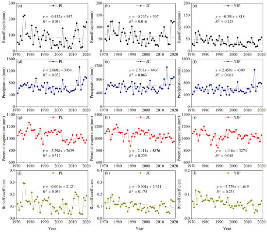 Trends of (runoff depth), (precipitation), (potential evapotranspiration), and (runoff coefficient) at three hydrological stations in the upper and middle reaches of the Jinghe River. (a–c) (runoff depth), (d–f) (precipitation), (g–i) (potential evapotranspiration), and (j–l) (runoff coefficient). PL, JC and YJP denote the Pingliang, Jingchuan, and Yangjiaping hydrological stations, respectively.