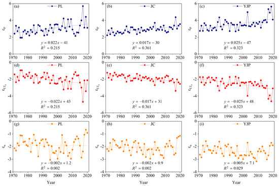 Trends in the interannual variability of the elasticity coefficients of (a–c) precipitation , (d–f) potential evapotranspiration , and (g–i) surface condition . PL, JC, and YJP denote the Pingliang, Jingchuan, and Yangjiaping hydrological stations, respectively.