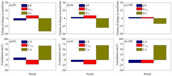 Volume and contribution of each element to runoff changes at three hydrological stations in the middle (b,c,e,f) and upper (a,d) reaches of the Jinghe River, 1971–2020. PL, JC, and YJP denote the Pingliang, Jingchuan, and Yangjiaping hydrological stations, respectively.
