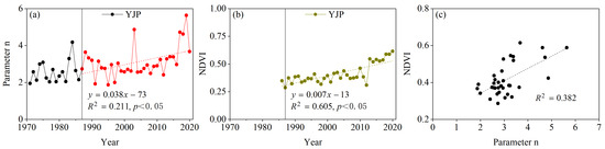 Relationship between the parameter n and the vegetation cover NDVI at the YJP hydrological station in the middle and upper reaches of the Jinghe River from 1986 to 2020. (a) Trend plot of surface parameter n; (b) Trend plot of NDVI; (c) Scatter plot of surface parameter n fitted to NDVI.