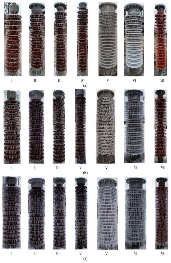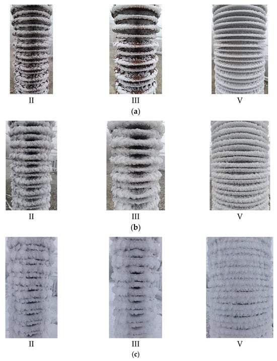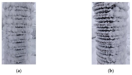- During t = 20~30 h, glaze and rime alternately appeared, transforming the insulator from rime icing to a mixed-phase icing form, as shown in Figure 7c. This type of icing was dense, opaque, and formed block-like ice with strong adhesion. During the formation of mixed-phase icing, glaze fell on the rime-covered insulator, causing the initially brittle rime to condense tightly as supercooled water flowed in. As more supercooled water infiltrated, the gaps between the insulator sheds gradually filled with ice, posing a serious threat to the insulator’s safe operation.
