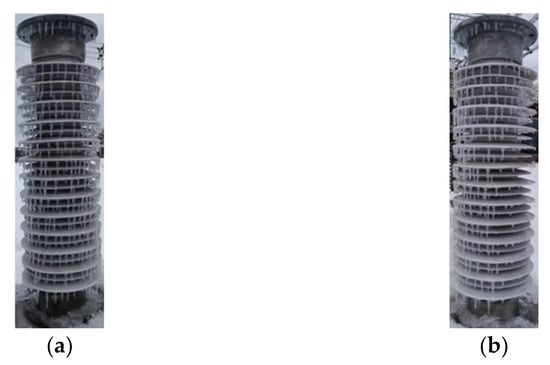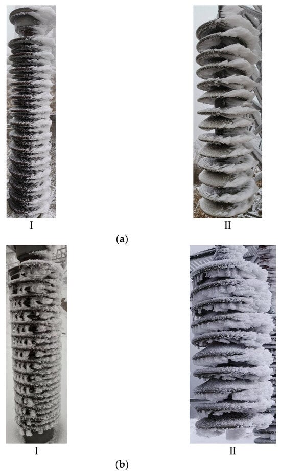 - Figure 12b shows the icing morphology of post insulators and insulator strings under mixed-phase icing conditions. A comparison of the two reveals that on one side of the post insulator, the gaps between the sheds were completely filled with mixed-phase ice, while on the other side, icicles had formed bridges between the adjacent large sheds. In contrast, the mixed-phase ice on one side of the suspension insulator string did not fully fill the gaps between the sheds, and the icicles on the other side only spanned half the distance between the sheds. This indicates that under the same icing conditions, the air gaps between the sheds of the post insulator are more easily filled with ice and bridged by icicles, posing a more severe insulation risk.