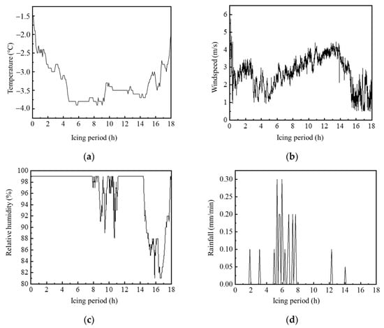 - During the formation of mixed-phase icing on the insulator, temperatures ranged from −6.5 to −3 °C, and wind speeds were relatively high, mostly between 4 and 10 m/s. The relative humidity of the air remained high, generally above 95%, though the rainfall was significantly lower than during glaze icing, and the icing formation time was also longer.
