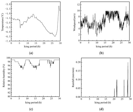 - Before and during the rainfall, the relative humidity around the insulator remained close to 100%. However, after the rainfall ended, the relative humidity in the environment gradually decreased to about 80%. Based on actual observations, there was no fog on Xuefeng Mountain during this period, indicating that the icing type was primarily glaze icing.