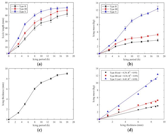 - The icing growth rate of insulators is influenced by their structural design. For example, during the icing period from 0 to 10 h, the icing mass increments for Type II, III, and V insulators were 7.24 kg, 10.38 kg, and 15.48 kg, respectively. This indicates that, within the same icing period, the Type V insulator experienced the largest increase in icing mass, while the Type II insulator showed the smallest. This difference can be attributed to the Type V insulator’s larger rod diameter, surface area, and shed spacing, compared to the smaller dimensions of the Type II insulator. As a result, under identical conditions, the surface of the Type V insulator captures more water droplets, leading to a faster icing growth rate, while the Type II insulator has a relatively slower growth rate.