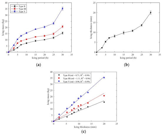 - The icing mass of the three types of insulators exhibits an initial rapid growth, followed by a slower phase, and then a resurgence of faster growth as icing time progresses. Taking the Type V insulator as an example, the increase in icing mass during the periods of 0–10 h, 10–20 h, and 20–30 h were 15.48 kg, 4.88 kg, and 14.92 kg, respectively. This pattern can be explained as follows: During the 0–10 h period (as shown in Figure 9), the low environmental temperature and high wind speed speed accelerated the heat exchange rate between the water droplets on the insulator surface and the surrounding environment. As the insulator’s effective area increased with icing, the likelihood of collision with water droplets also increased, leading to faster icing growth. During the 10–20 h period, the environmental temperature and relative humidity remained relatively constant, while wind speed gradually increased to 10 m/s. At this point, the increase in the insulator’s effective diameter reduced the probability of supercooled water droplets colliding with the insulator. The decrease in collision probability outweighed the increase in effective area, resulting in a slower icing growth rate. In the 20–30 h period, rainfall began, causing a significant amount of rainwater to infiltrate the rime on the insulator surface. This trapped water then froze under the influence of low temperatures and cold winds, transforming the brittle rime into a dense, block-like mixed-phase ice, which increased both the density and mass. As a result, the icing growth rate accelerated again during this stage.