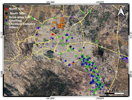 Industrial wastes have been detected with high concentrations of calcium sulfate and fluorite [42] near ex-mining zones on the west and the east of SLPMA; there are more than 20 environmental liabilities with different kinds of metal composition. In the northwest, it is one of the largest zinc plants in Latin America. It also has a sulfuric acid plant and generates other metals as sub-products. There are more than 100 brick kilns all over the NE zone with minimum control or poorly verified, and because of that, they burn all kinds of waste such as plastics, wood, coke, or even electronic waste. In the south, there are the two main industrial zones, which include foundries, chemical and metallurgical industries, construction activities, and the main avenue named 57th Avenue, which transports nearly 20% of the population from the San Luis Potosí city through the industrial zones every day and is used by the passenger transport but also by the freight and merchandise transport [42]. Other significant sources include two power plants, the food industry, and traffic dust resuspension in paved and unpaved roads.