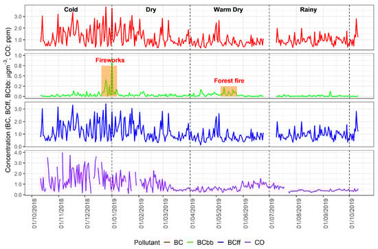 BC, BCff, and BCbb concentrations (µg m−3), and CO concentrations (ppm) at the north monitoring site.