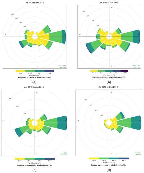 Wind Roses sorted by season (a) cold 2018 (b) dry 2019 (c) warm dry 2019 (d) rainy 2019. The data were obtained through the SEGAM network at the Biblioteca site (SEGAM, 2019).