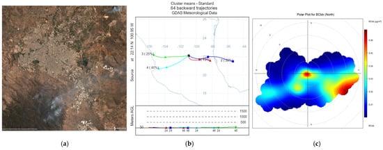 (a) Sierra de San Miguelito fire emissions during May 2019. Sentinel-2, LA2. (b) HYSPLIT backwards average trajectories towards San Luis Potosí downtown during the forest fire period. (c) Polar Plot of BCbb concentration (µg m−3) over the North Site in SLPMA in 2019.