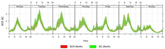 On the one hand, in the northern site, there were daily concentrations (Annual average BC = 1.11 µg m−3) that can be considered low. However, in this area, there are also very high levels of continuous emissions during certain intervals of the day between 5 h and 12 h generated by specific fixed sources that can contribute to respiratory, cardiovascular, or reproductive diseases, mainly at a chronic level for the population of the area.