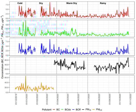 The rainy season (July, August, September) showed slightly higher BC concentrations than the warm and dry seasons but still lower than the cold and dry seasons. This could reflect the influence of rainfall on pollutant deposition and atmospheric cleaning. During the warm dry and rainy season, the highest daily concentrations were registered due to the brick kiln zone located east of the monitoring site.