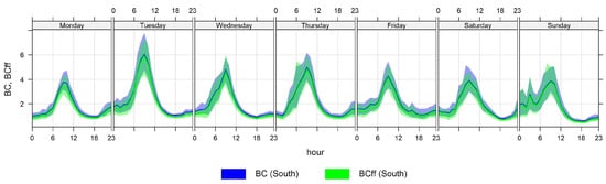 Average weekly BC concentration (μg m−3) in the South Site (2019–2020). BC in the blue line and BCff in the green line. The shading highlights the standard deviation.
