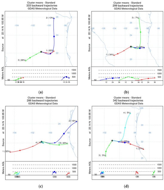 HYSPLIT average back trajectories at South site “FCHYS” by season: (a) cold 2019 (b) dry 2020 (c) warm dry 2020 (d) rainy 2020.