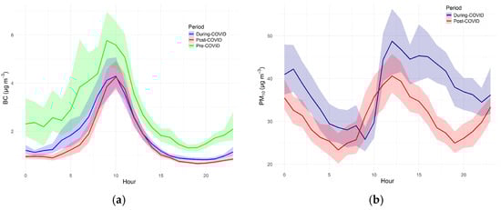 (a) BC and (b) PM10 average daily concentrations during the COVID period.