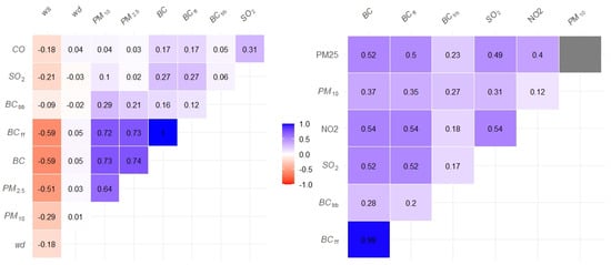 Due to the non-parametric distribution of air pollutant data, it was necessary to find a more robust method against extreme values and asymmetric distributions. Figure 10 represents a correlation matrix plot (Spearman correlations) between the air pollutants and wind speed (ws) and wind direction (wd) for all the evaluation periods at each monitoring site. The intensity or blue color indicates a positive correlation, which represents the strength of the relationship between each pair of parameters.