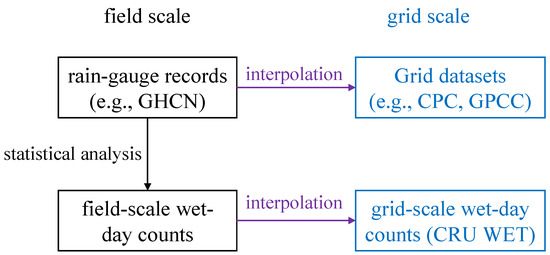 It should be noted that the CRU not only provides the climate variable of monthly precipitation (PRE) but also counts the wet days (WET) in the specific month, which, after dividing the overall days of the corresponding month, gives the rainfall frequencies. As illustrated in Figure 1, statistical analysis is conducted on the rain gauge records to obtain wet day counts, which then interpolate onto the grid to generate CRU WET products, whereas CPC and GPCC grid datasets of precipitation directly are directly interpolated from rainfall records. Therefore, rainfall frequencies from grid data of CRU WET may be less influenced by spatial interpolation and still close to field-scale values. This topic will be comprehensively addressed in Section 3.1 by comparing CRU WET with GHCN observations.