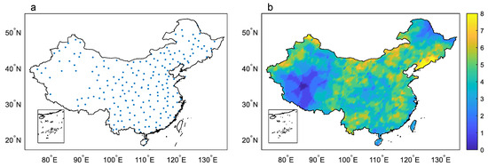 (a) Weather station locations across China for GHCN-Daily precipitation data; (b) number of rain-gauge stations across China used to interpolate into each 0.5 × 0.5° grid for CRU WET products.