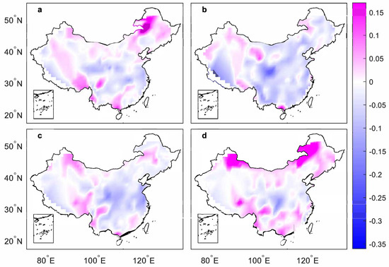 To compare these two datasets, we matched each weather station in GHCN-Daily with the nearest grid point from CRU WET. The differences in rainfall frequency in these two datasets are shown in Figure 3. As can be seen, there are indeed certain inconsistencies between these two datasets, particularly in winter when rainfall frequencies from CRU WET are often larger than those from GHCN-Daily in most parts of China (shown in red color in the maps). Except for central China, most regions generally appear to have larger rainfall frequencies from CRU WET. In the south of the Inner Mongolia Plateau, Daxinganling, the Junggar Basin, and the Tibetan Plateau, the differences in rainfall frequency can reach 0.15 day−1. On the contrary, CRU WET in summer tends to have smaller rainfall frequencies in most regions across the country, except for some parts of western China, Beihai in the south, and some parts of the Daxinganling in the north.