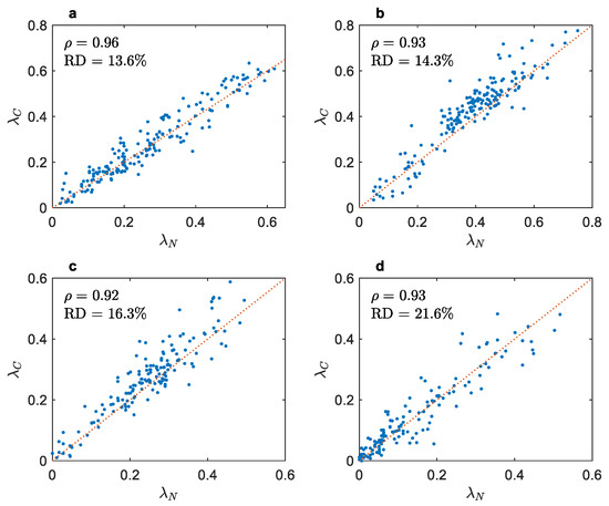 where the overbar refers to the sample averages. The correlation coefficient only measures linear relationships between two sets of data and is not affected by the scale of the data. The nonlinear differences between two datasets may be captured by the relative deviation, which provides insight into how significant the differences are in proportion to the size of the values.