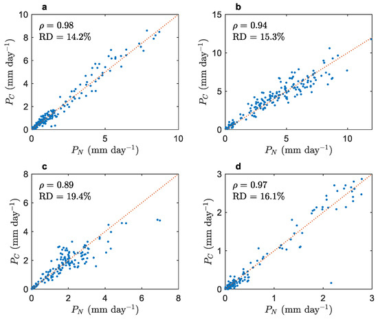 However, it should be noted that precipitation from most of these global datasets is often averaged within each grid of relatively large areas and this averaging reduces the spatial variability of rainfall. The rainfall rate is assumed to be homogeneous over each grid cell with a typical size of tens of kilometers. In real conditions, contrasting weather patterns (rain and no rain) can be found in regions a few kilometers apart. It is widely recognized that the rainfall frequency estimated from these global datasets exceeds that derived from rain gauge records [32]. Rainfall frequency tends to be unity at the global scale as it is always raining somewhere over the world; grid-scale rainfall frequency, if it is accurate, should theoretically approach the field-scale value with increasing grid resolutions.