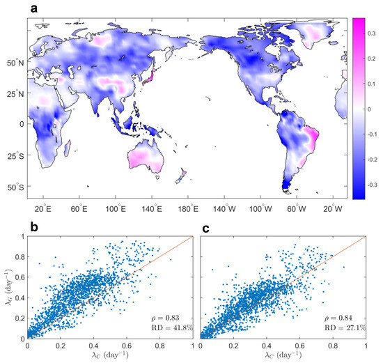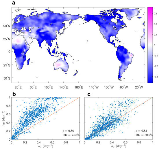 Rainfall frequencies from CRU WET, , and GPCP, , are presented as the (a) geographical distributions of and (b,c) scatter plots of and . In (b,c), the statistics of the correlation and relative difference between these two rainfall frequencies are given in the text as and RD. is calculated as the frequencies of wet days defined as the daily rainfall rate larger than a threshold of 0.1 mm in (b) and 0.5 mm in (c), whereas the threshold for is always 0.1 mm.