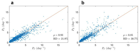 Since is a monotonically decreasing function of (see Section 2), it is possible to increase the wet day thresholds of to reduce the overestimated rainfall frequencies. To test this point, we also defined wet days as daily accumulated rainfall larger than 0.5 and 0.8 mm in GPCP and ERA5, respectively. The corresponding frequencies of wet days are compared with those from CRU WET with wet days defined as daily rainfall larger than 0.1 mm (see Figure 6c and Figure 7c). As can be seen, the correlations are similar for different thresholds but the relative differences are significantly reduced from 41.8 to 27.1% for GPCP and from 74.8 to 30.6% for ERA5. Therefore, adjusting wet day thresholds is an efficient method for calibrating rainfall frequencies, although these thresholds are data-source specific. It is straightforward to recommend higher for data with more frequent rainfall events, thus reducing by redefining wet days.