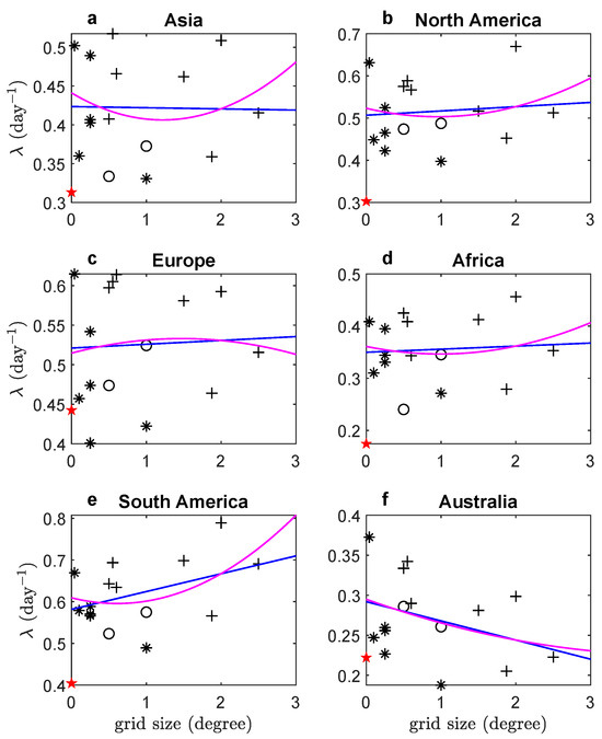 Multi-source rainfall frequencies and the corresponding data source resolutions over (a) Asia, (b) North American, (c) Europe, (d) Africa, (e) South America, and (f) Australia. The circles, stars, and crosses are derived from the independent study of [46] with datasets based on rain gauge observations (CPC, GPCC-daily), satellite products (GPCP 1dd, CMORPH, TRMM 3B42, PERSIANN CCS, PERSIANN CDR, MSWEP), and reanalysis (20CR, CFSR, NECP1, NCEP2, JRA55, ERA Interim, MERRA), respectively. The blue and magenta lines are first- and second-order polynomial fits. The filled pentagrams are estimated from CRU WET data as the reference for the field-scale rainfall frequency. All rainfall frequencies are estimated over the period 2003 and 2010. Full data source names are provided in the abbreviation list.