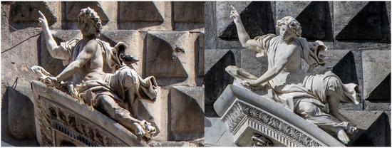 The church of “Gesù Nuovo” is found in Piazza del Gesù (Naples, Italy), at the western end of Decumano Inferiore street. Formerly serving as a household for the noble family Sanseverino, it was later reinstated as a church when it was acquired by the Jesuit order in 1584 [21]. The façade facing the square features a peculiar pyramidal motif; the portal is adorned with a pair of red granite columns, originally transferred from Apollo’s temple, along with a marble composition consisting of two pairs of angels, one of which carries the Jesuit order emblem. During the second world war, the square was bombarded, causing non-negligible damage to the decorations; furthermore, in the latter part of the XX century, the earthquakes of 1962 and 1980 also constituted a major contributor to the statues’ degradation.