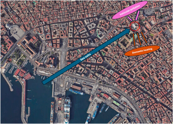Apart from the mechanical damage, most of the degradation of the façade is the product of the interaction of various environmental factors: among these, sea salt deposition [22], carried by the wind from the nearby sea, is one of the most influential natural sources of deterioration. As the square in front of the church was used until the middle of the 1990s as a parking spot for buses and cars, vehicular pollution, both recent and historical, probably constitutes the most influential anthropic source of pollution [23], alongside the products of domestic heating [24] and restaurant-related combustion activities (Figure 3).