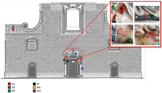 Some of the deposits’ sampling spots: most of the points were selected on the decorations to be subjected to restoration and on the columns of the portal; to act as a confrontation, C1 was sampled from the upper side of the façade, several meters above. In the red square on the upper right, the sampling spots were chosen on the stone decorations above the portal.