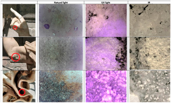 Observation through optical, UV and IR microscopy was employed, both before and after the restoration intervention, to observe the effects of consolidation and the cleaning off of patinas. It showed microscopic patterns consistent with some of the other analytic evidence gathered. Particularly, on the finger of one of the angel statues (Figure 6), particulate deposits were easily identifiable, resulting in the blackening of the stone texture. Other spots, such as the elbow, showed evident signs of microbial colonization, with some colonies spreading through the exfoliated layers of stone.