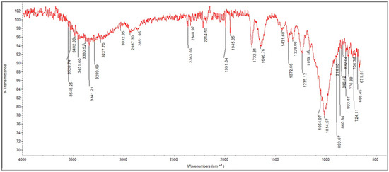 Fourier Transform Infrared Spectroscopy was employed to analyse the chemical structure, functional groups and bonds of the compounds featured in the stone decorations above the portal of the church [26]. The analysis was carried out using a Nicolet iS10 Thermo Fisher Scientific FT-IR spectrophotometer, with a dried and sealed optical system and optical bench, equipped with KBr windows with a protective CaF2 coating.