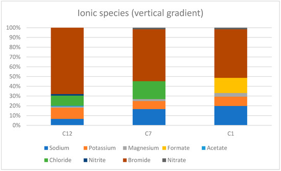 As observed, C7 and C12, collected 10 m and 6 m above ground, respectively, do not feature a comparable presence of organic acids; nonetheless, they differentiate from C1 because of the presence of chlorides at lower heights (C7: 3.0222 ± 0.0423 mg/g; C12: 1.831 ± 0.0201 mg/g). The central sampling point (C7) seems to be an accumulation point for some species such as sulphate, nitrate, chloride and sodium with the highest concentration reached at this height. Finally, the only species presenting a linear dependence from the height of sampling are bromide, nitrite and potassium with a negative trend and magnesium with a positive one.