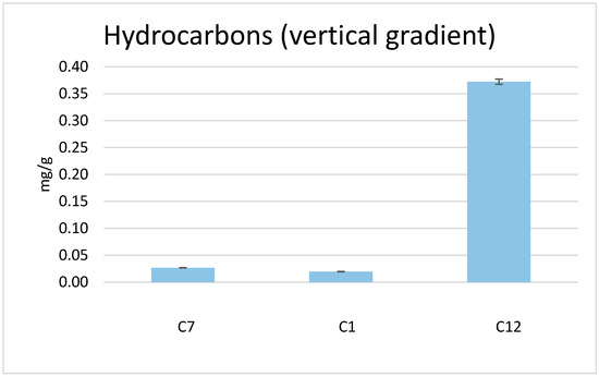 In Figure 9, the concentration of hydrocarbons along the vertical axis is shown; their overall concentration was significantly lower at higher heights (0.027 ± 0.001 mg/g) when compared to the samples nearer to the ground (0.372 ± 0.005 mg/g) and was comparable to those at the intermediate height (0.0197 ± 0.001 mg/g). This observation is consistent with the consideration that the main source of these pollutants is represented by vehicular traffic, so it is admissible that at the lowest height, the impact of this process is more evident, also considering that the square in front of the façade was used for parking in the past, as discussed before.