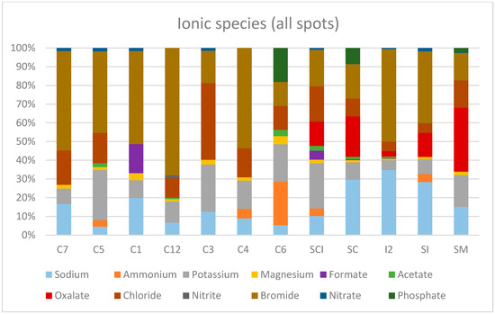 Comparing the data obtained from the ionic chromatography of all samples (Figure 10), some peculiarities emerge. While most of the samples present a considerable amount of bromides, probably the product of stone erosion, the concentrations of organic acids differ considerably in different spots: most of the samples collected on the upper portion of the portal (SCI, SC, SI and SM) present a higher percentage of oxalate (SC, the one consisting of only the black crust, featuring the highest concentration at 4.787 ± 0.053 mg/g), while C6, collected from the patinas on one of the statues, features the highest concentration of acetate (1.132 ± 0.011 mg/g).