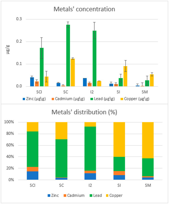 Metal concentrations (top) and metal distribution (%) (bottom) from SCI, SC, SI, I2 and SM spots.