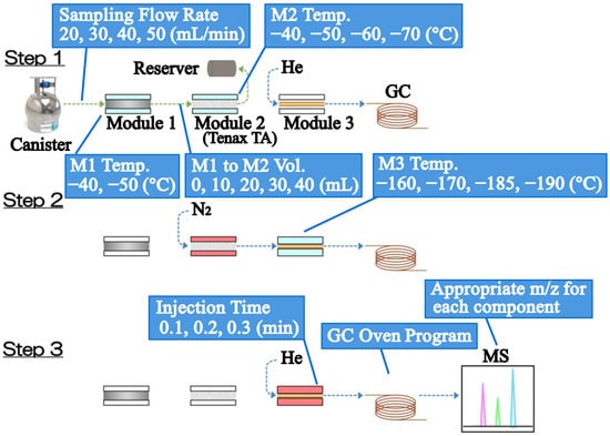 - Step 1: Air samples were drawn into module 1 (M1, empty trap) and module 2 (M2, Tenax TA trap), which were cooled by liquid nitrogen; the moisture was coagulated and dehydrated in M1. For VOCs, some heavy VOCs were maintained in M1, and light VOCs were adsorbed in M2. Therefore, a small amount of sweep gas (N2, purity of 99.9999% or higher) was blown from M1 to M2 to transfer the heavy VOCs to M2. Other inorganic gases interfering with the measurements, such as N2, O2, CO2, and Ar, passed through M1 and M2 and were sent to the reservoir tank for removal.