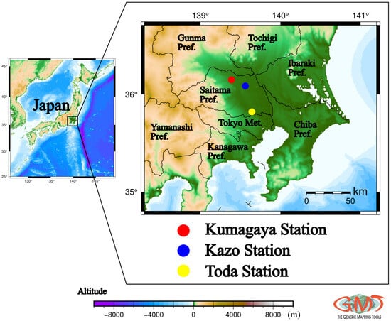 The Kumagaya station (36°08′51.8″ N 139°23′15.8″ E) is located on the premises of the city office of Kumagaya City, which has a population of ca. 191,000. The trunk road National Route No. 17 (estimated 24 h traffic volume: 10,916 vehicles, percentage of heavy-duty vehicles: 8.9%) is located approximately 425 m southwest, and another trunk road, National Route No. 407 (14,801 vehicles, 14.1%), intersects with National Route No. 17 approximately 690 m west–southwest. The observation site was positioned as an ambient air pollution monitoring station (AAPMS).