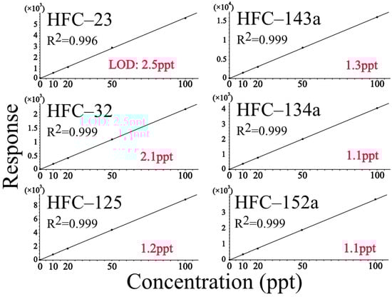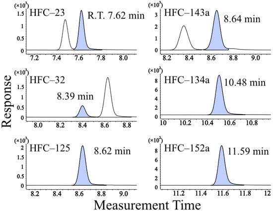 The GC oven was verified by lowering the initial temperature step by step from room temperature, and by setting the oven at −50 °C, the peak separation of HFC–32 and HFC–125, whose monitor ions (m/z: 51) overlapped, was successfully achieved. The fragment patterns obtained from the standard gas scan measurements were checked against the NIST library, and the retention times for each HFC component and monitor ions (qualitative and quantitative ions) were selected and analyzed in the SIM mode.