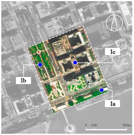NAPE district is situated in the southern region of the Macao Peninsula. The focus of this study comprises the area to the south of Song Yusheng Park and extends to include parts of the coastal district to its east. This area is notable for its large-scale architectural developments, including prominent entertainment venues such as Wynn and MGM. It is characterized by a predominance of semi-enclosed high-rise buildings with podiums, strategically placed along the streets in a matrix-like layout. The NAPE field measurement zone designates three measurement points, labeled from to , strategically chosen to ensure that the distance between these points ranges from 100 to 500 m. This setup is intended to comprehensively capture a range of spatial characteristics, as illustrated in Figure 2.