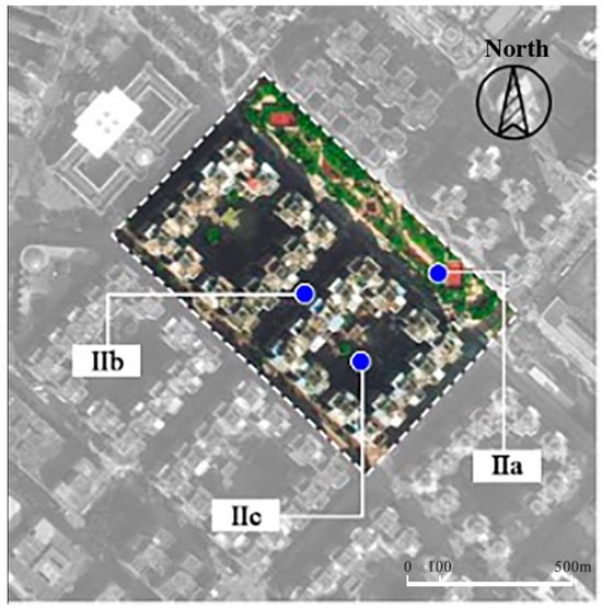 The Areia Preta District is situated in the northern region of the Macao Peninsula. This section focuses on a section of the Areia Preta Park and the two adjacent large residential areas to its south. The field measurement zone for this district is situated beyond the older Areia Preta area and was developed around 1995 through the introduction of reclaimed land. This newly formed area is framed by East Ma Road to the west, Areia Preta Seaside Road to the south, and is bordered by the ocean on both its eastern and northern edges. It features a uniform distribution of large-volume high-rise residential buildings. The southern section is mainly occupied by semi-enclosed courtyard high-rises, whereas the northern seaside area is predominantly composed of semi-enclosed, ultra-high-rise residential buildings with podiums. The space between these two areas mainly exhibits a cross-arrayed high-rise courtyard spatial configuration. In the Areia Preta measurement district, three measurement points, from to , are established, as presented in Figure 3. The chosen field measurement area includes four high-rise buildings in total, which are grouped in pairs and connected by middle corridors, yielding a semi-enclosed high-rise courtyard spatial configuration.