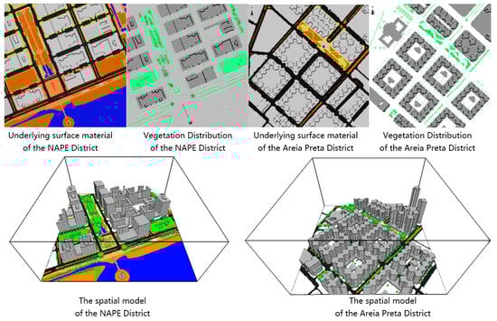 In this study, we utilized ENVI-met version 4.4.6, an advanced software tool for simulating the microclimate of urban areas [24]. The granularity of ENVI-met’s computational grid, which varies from 0.5 m to 10 m, along with its ability to simulate over a period of up to 72 h, makes it exceptionally apt for conducting detailed studies of urban and architectural environments [25]. The 72-h limitation is a standard duration set by the software developers to balance detail and computational efficiency. To create the three-dimensional spatial models, we integrated the “Envi-met INX” plugin from the SketchUp plugin platform into SketchUp Pro 2023 software. This plugin, by utilizing the designated grid precision and the spatial configuration of the model in the simulation environment, facilitates the automatic generation of model files that are compatible with ENVI-met. This method greatly reduces the likelihood of errors that could arise from manual grid placement, thus significantly improving the precision of our simulations. To ensure the accuracy of our simulation data in reflecting the real-world scenario, we expanded the three-dimensional spatial model by at least 100 m beyond the intended research area. The simulation grid’s vertical scope was capped at twice the height of the tallest building involved. The simulation spanned from 9 a.m. to 5 p.m. on 11 May 2021. In an effort to minimize errors, we extended the simulation’s timeframe to run from 5 a.m. to 9 p.m., thereby increasing the total duration of the simulation to 13 h [26]. We fine-tuned the core meteorological parameters in ENVI-met to reflect the actual weather conditions, aiming to accurately capture the effects of real-world spatial configurations on the local microclimate. To ensure the spatial model accurately represented the real environment, we meticulously set up the substrate and vegetation in the model as depicted in (Figure 5). In this figure, the green areas indicate the vegetation distribution, while the orange and yellow areas represent the underlying surface material. The software-calculated Physiological Equivalent Temperature (PET) was employed to measure human comfort levels [27], with the clothing insulation value pegged at 0.5. Hardware limitations led us to opt for the default basic materials for the structures’ exterior surfaces. This decision struck a balance between maintaining model fidelity and managing computational demands, thus ensuring the simulation remained both realistic and manageable [27].